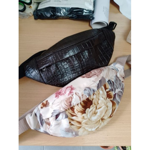 Поясная сумка классической формы (банан) с основным отделением и внутренним карманом на молнии на задней стенке. Материал верха текстиль в сочетании с экокожей, или экокожа целиком. Лямка регулируемая, стропа 30мм, фурнитура пластик, застежка-фастекс. Подкладка шелк, оксфорд, микровелюр (возможны разные варианты). Окантовка швов тесьмой.